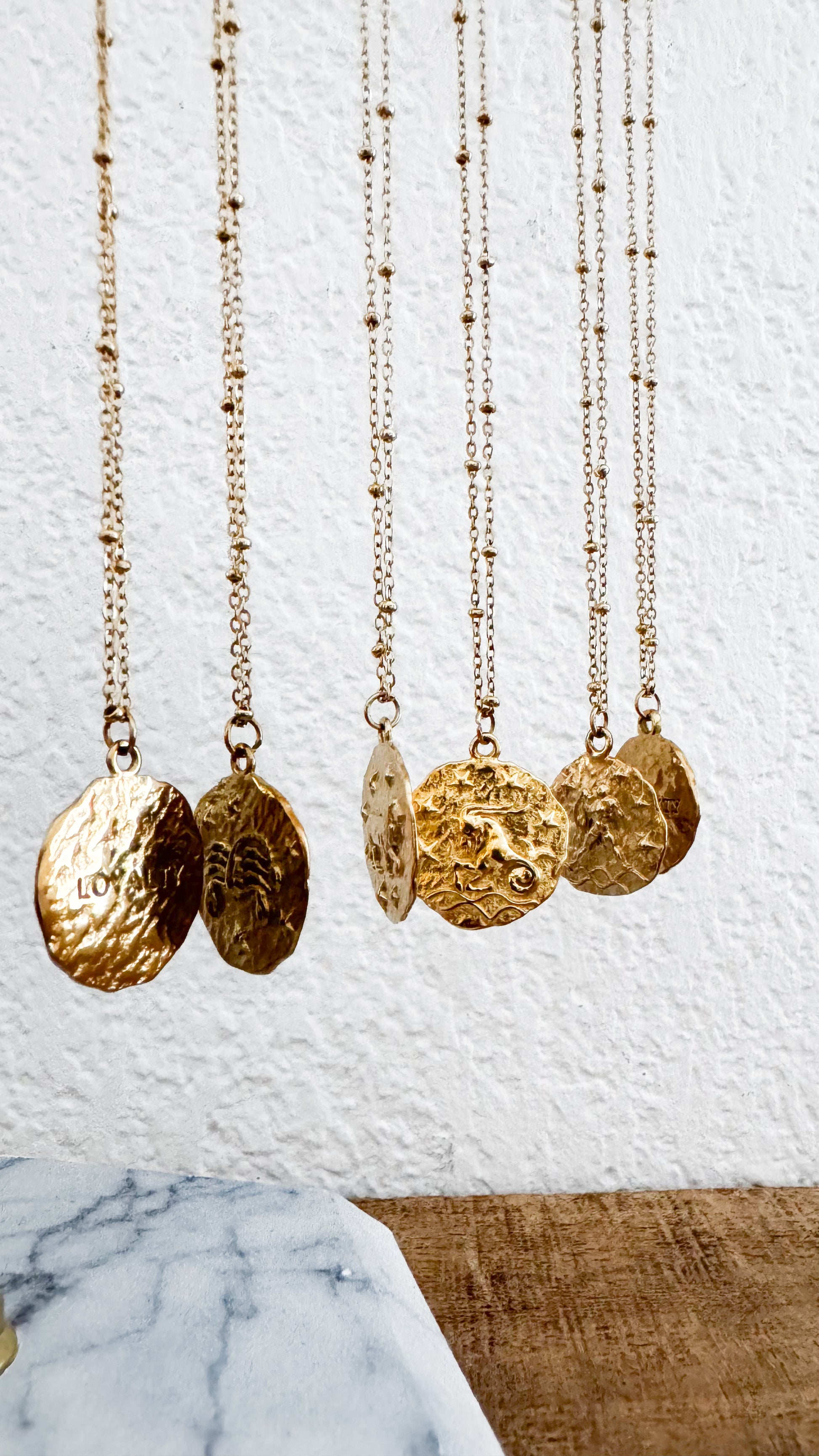Au dos du médaillon, un mot symbolique incarne la force intérieure et la lumière propre à chaque signe astrologique.