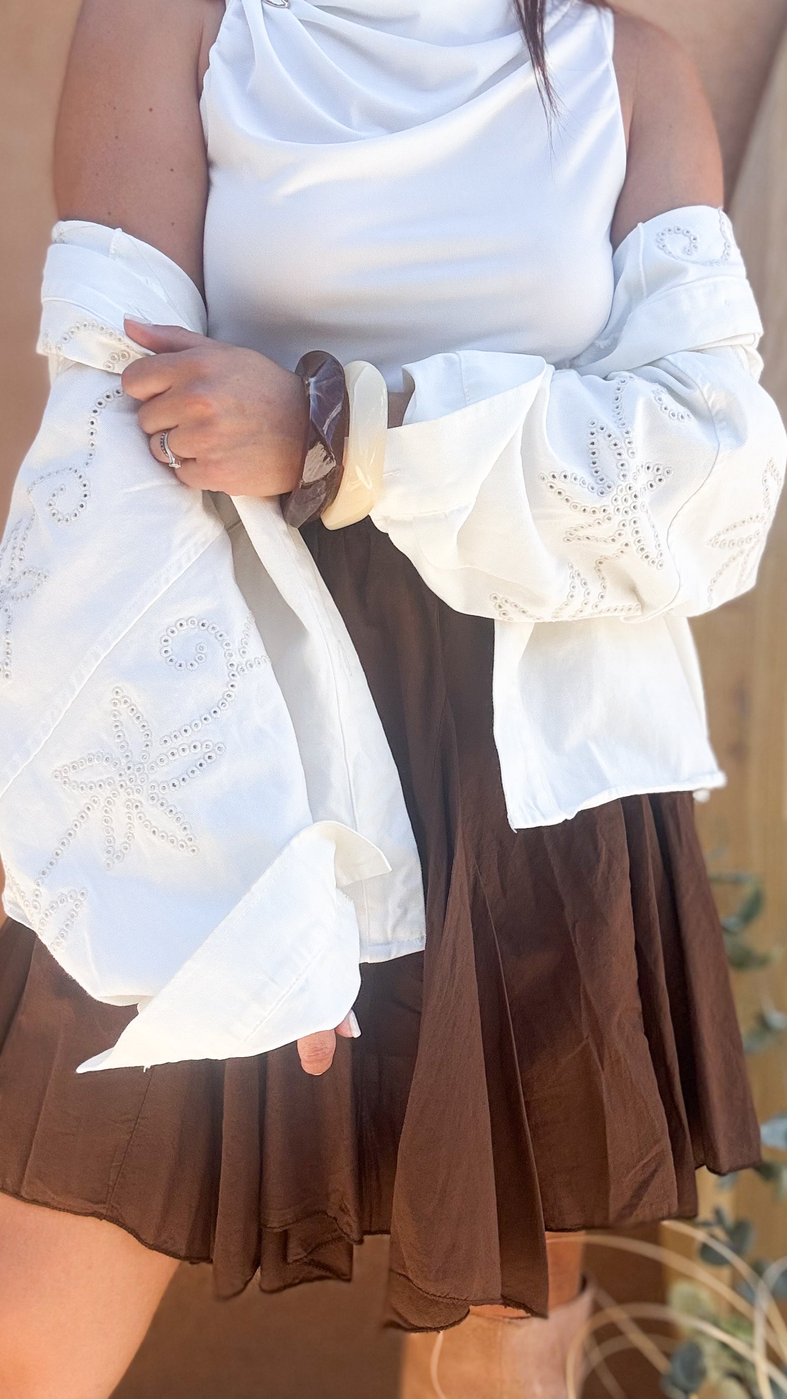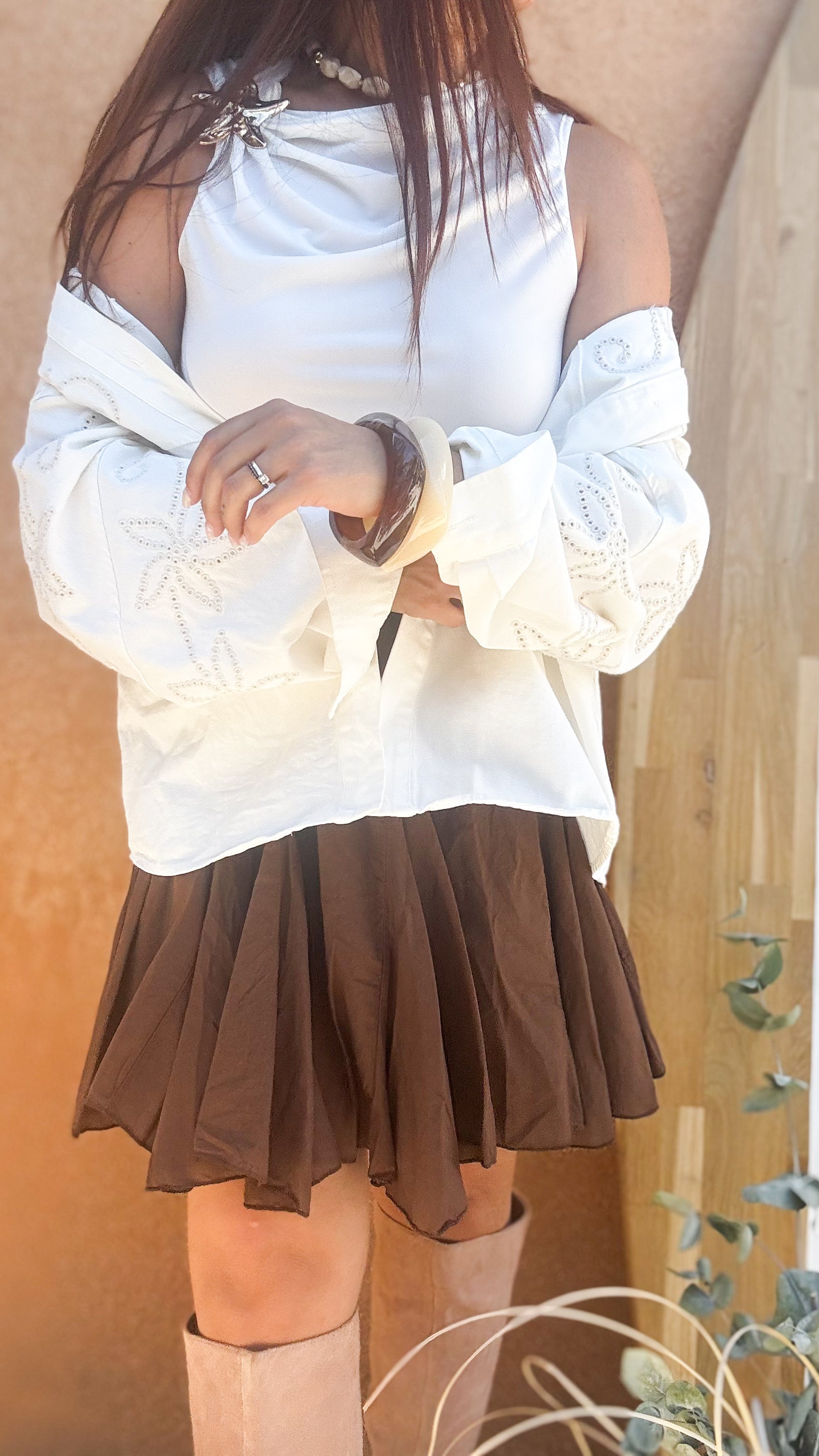 Cette jupe évasée chocolat est une vraie pépite automnale pleine de charme ! Sa teinte chaude et gourmande rappelle la douceur d’un coucher de soleil, tandis que sa coupe fluide apporte légèreté et élégance à chaque mouvement. Facile à porter, elle s’associe aussi bien à un pull oversize douillet qu’à une blouse féminine. On l’adore pour son côté chaleureux, son style intemporel et son aura solaire qui réchauffe instantanément tes looks de mi-saison.