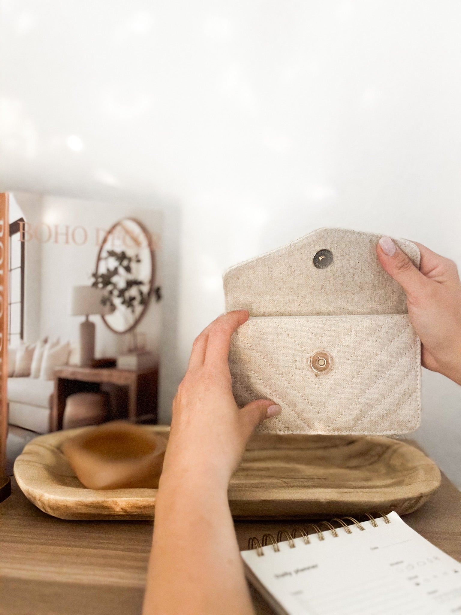 Craquez pour ce portefeuille en lin matelassé, doux et élégant, pensé pour accompagner votre quotidien avec style. Compact mais pratique, il accueille cartes, billets et petits essentiels. Son petit cœur doré apporte la touche solaire signature Lou Hameou.