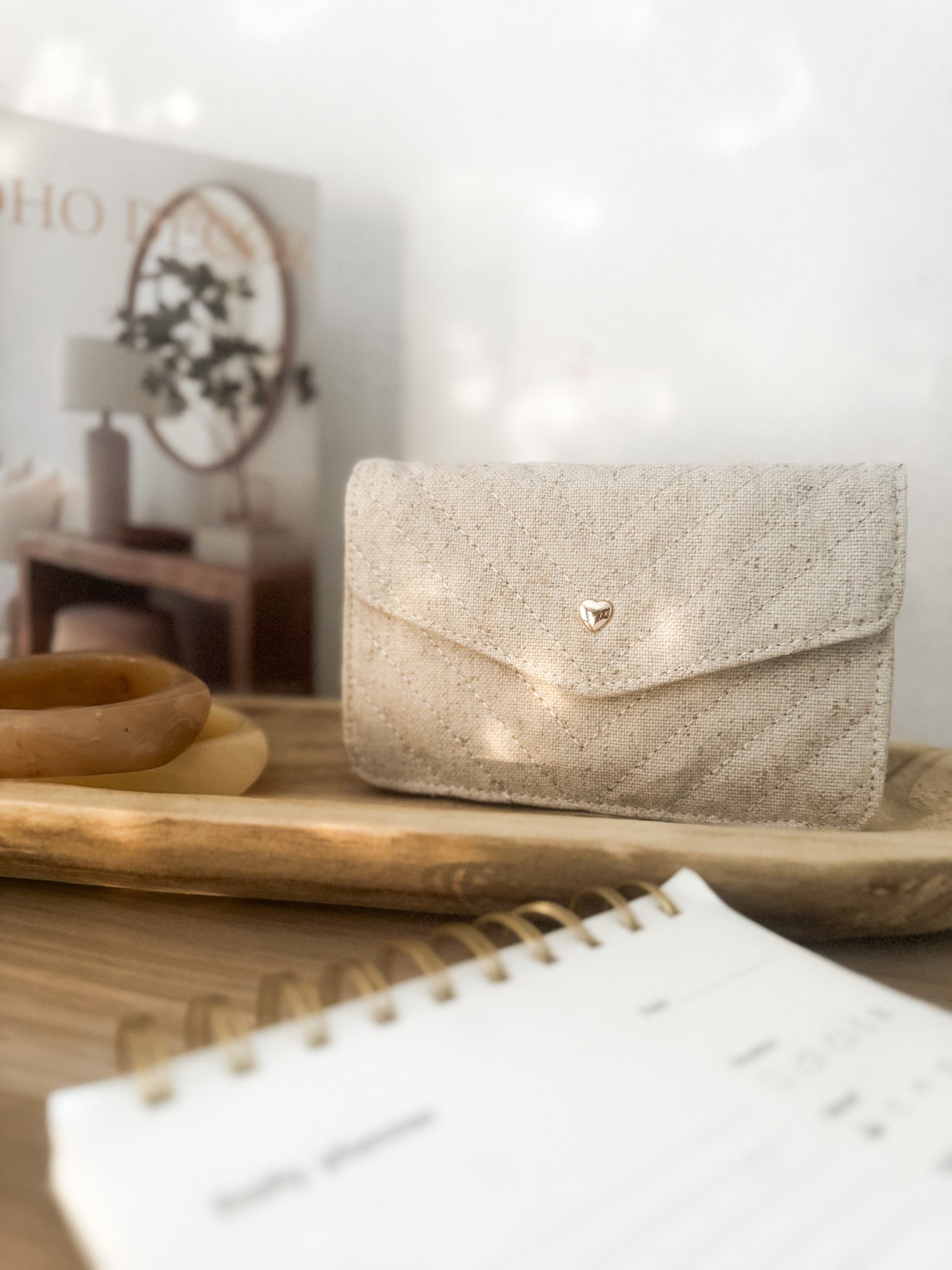 Porte-feuille en lin matelassé – détail cœur doré (17×10×2 cm)