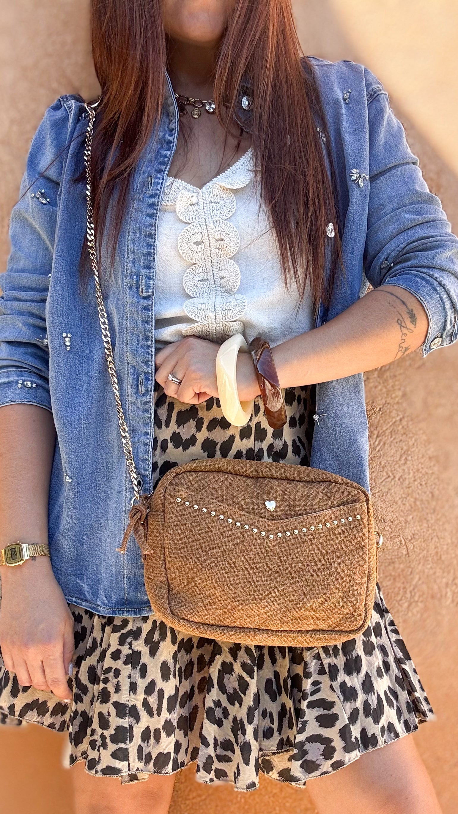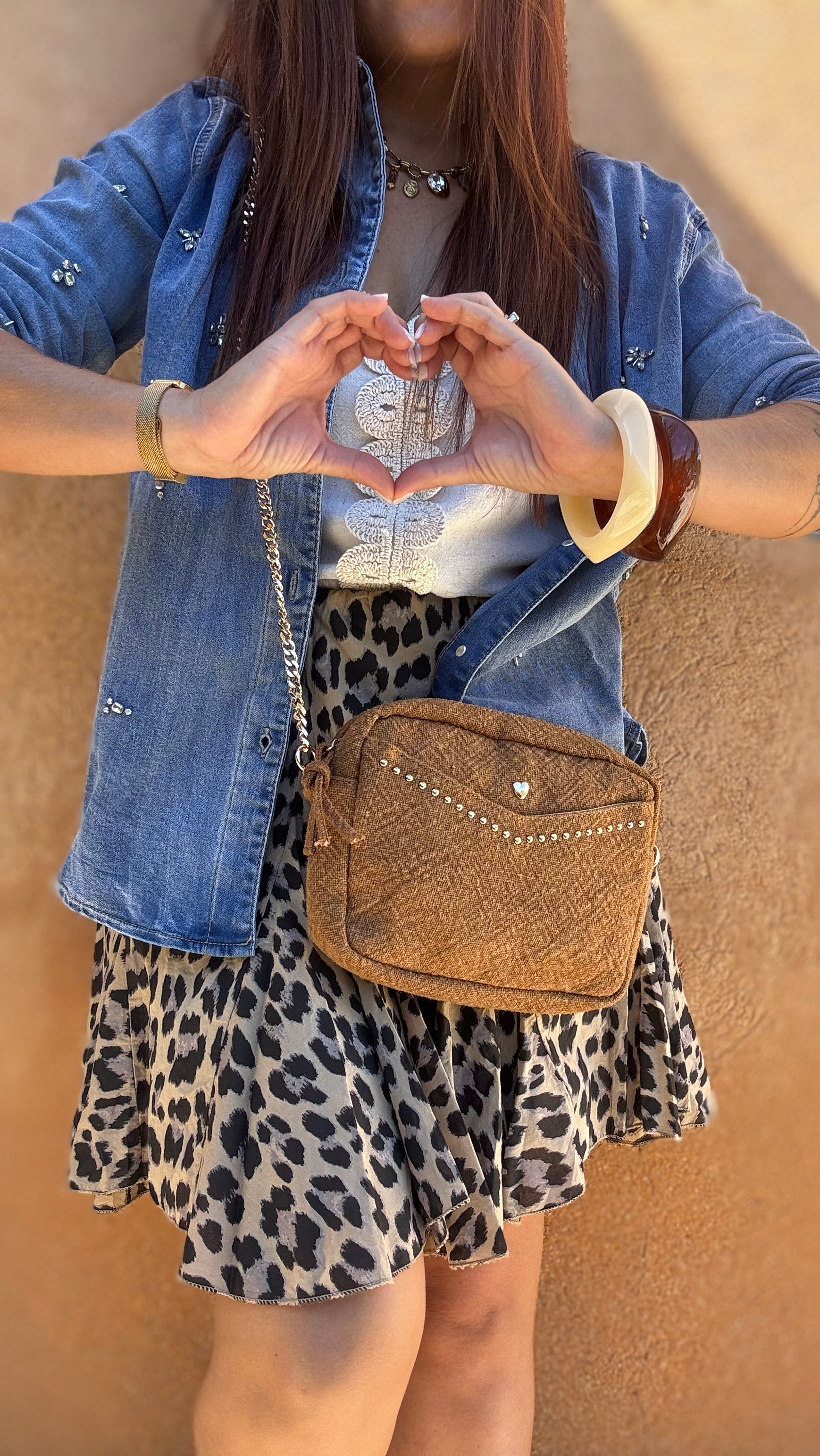 Ce sac en lin cognac est la pièce solaire et élégante qui accessoirise toutes tes tenues. Sa teinte chaude et naturelle se marie facilement à tous les styles, tandis que ses finitions dorées apportent une touche chic irrésistible. On craque pour son petit cœur doré plein de délicatesse, ses clous et sa chaîne dorée qui mêle modernité et féminité. Pratique et raffiné, il t’accompagne au quotidien comme en soirée grâce à son format idéal et ses rangements bien pensés.