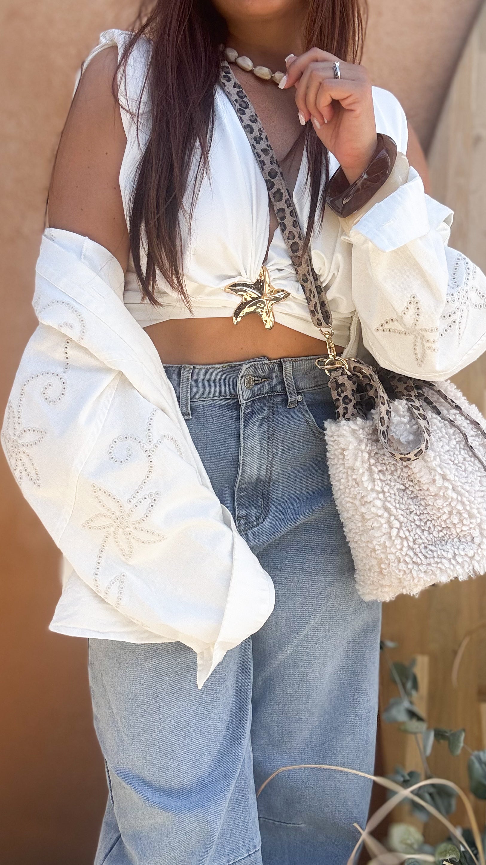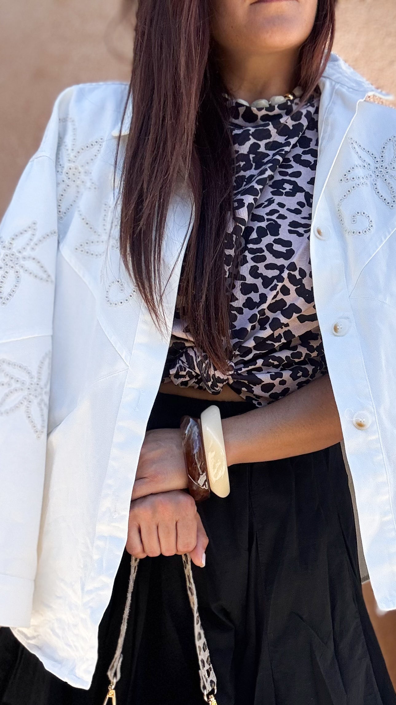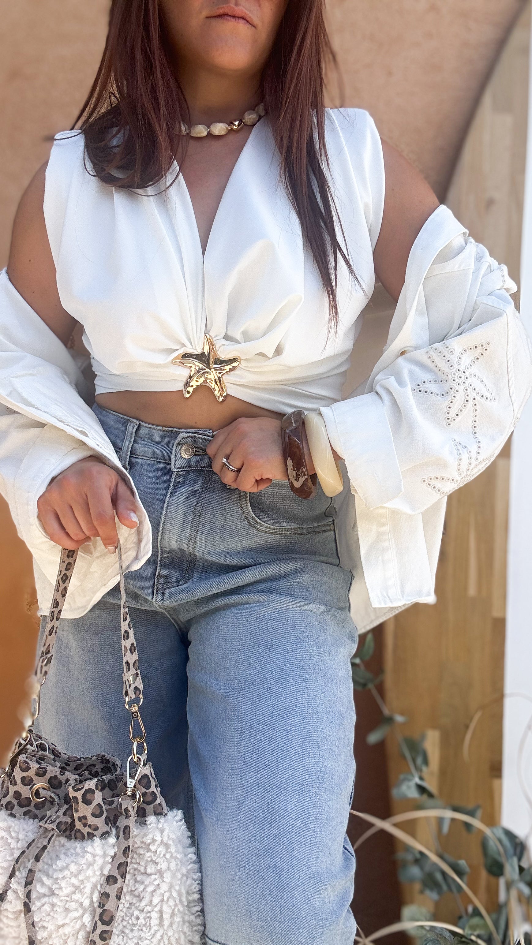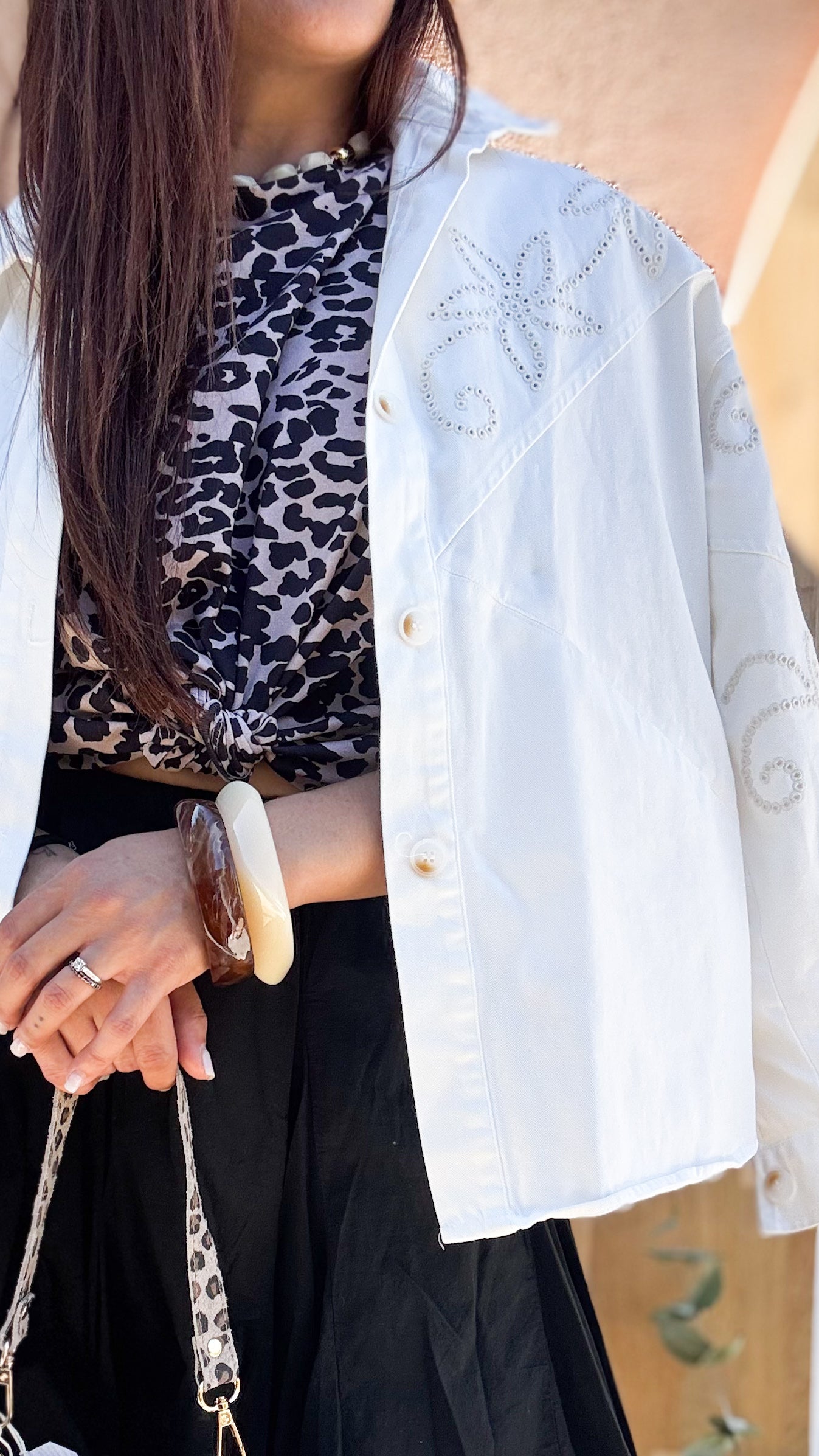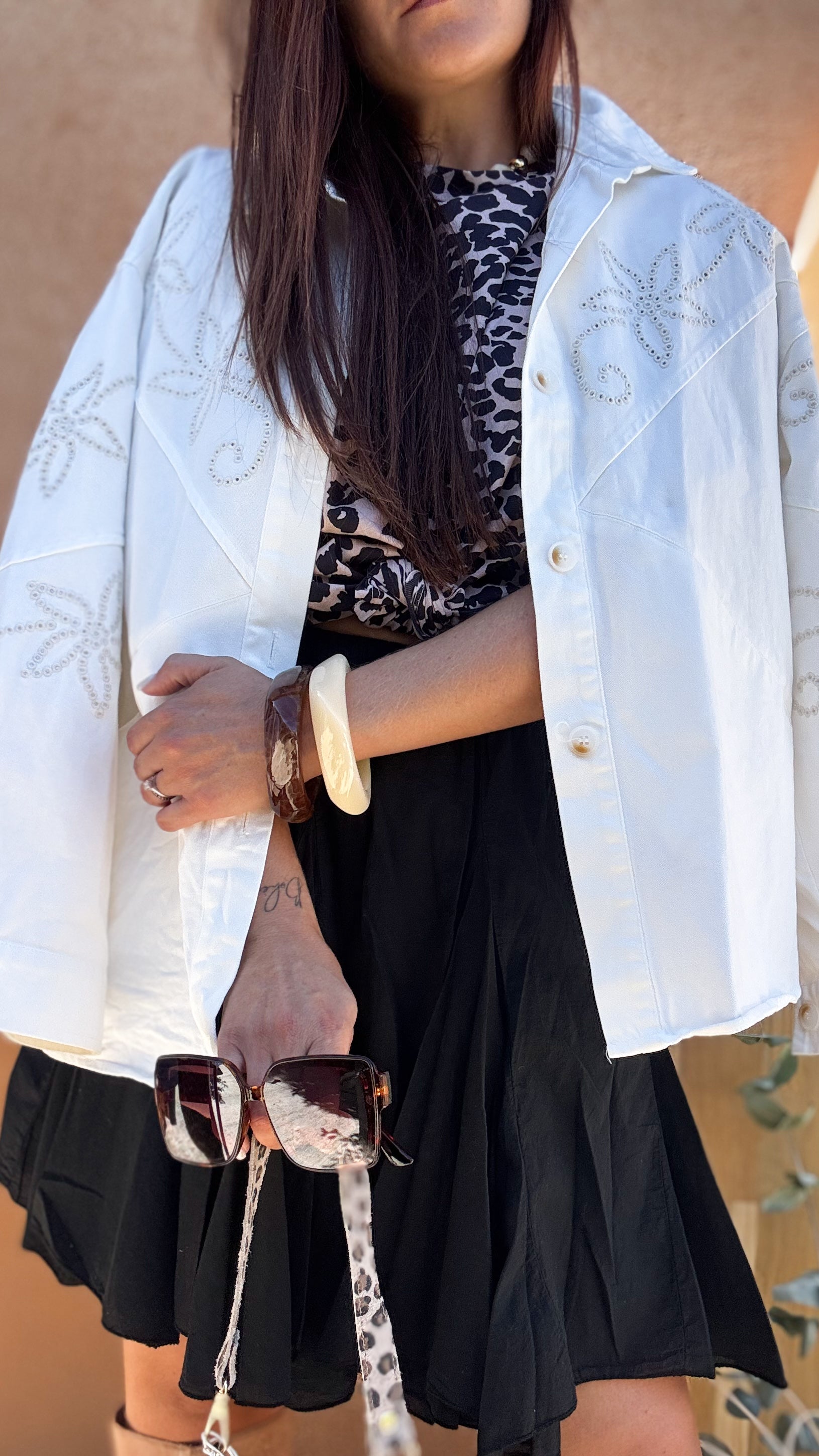 Cette surchemise blanche brodée est une pépite lumineuse qui conjugue élégance et décontraction. Avec sa coupe droite légèrement oversize, elle apporte une allure moderne et effortless à tes looks. Ses broderies délicates offrent une touche raffinée, tandis que ses deux poches avant lui donnent un esprit utilitaire tendance. On l’adore pour sa polyvalence : portée ouverte sur un débardeur pour un style casual chic, ou fermée comme une chemise pour une allure plus sophistiquée. Légère et 100% coton, c’est la pièce idéale pour briller avec simplicité en mi-saison.